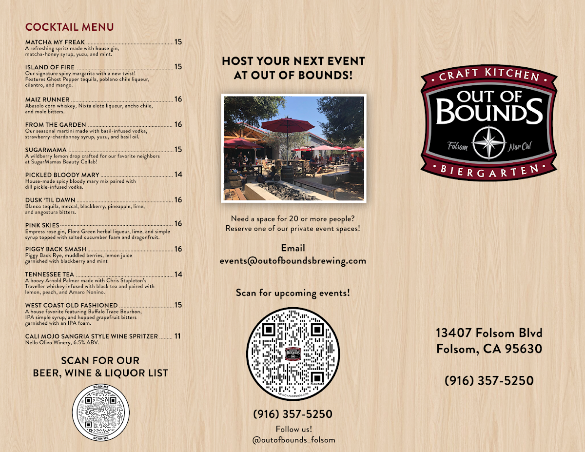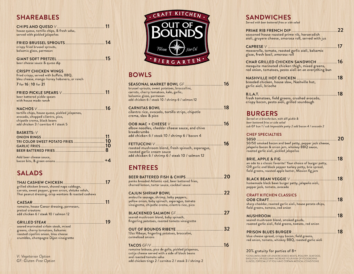 Whether you're a local or just passing through Folsom, make sure to stop by Out of Bounds for a dining experience that is sure to satisfy cravings for hearty American dishes and craft beer.